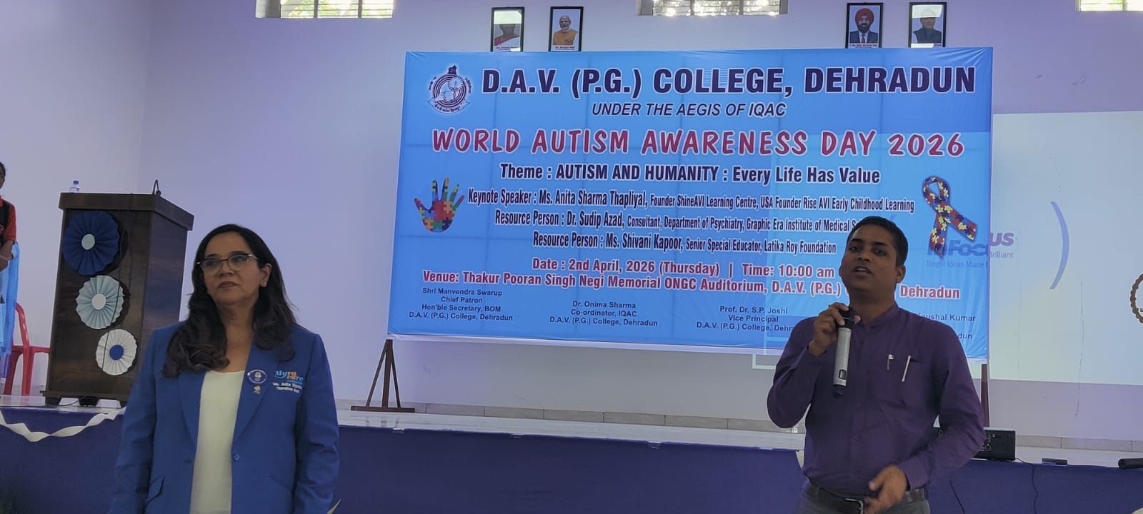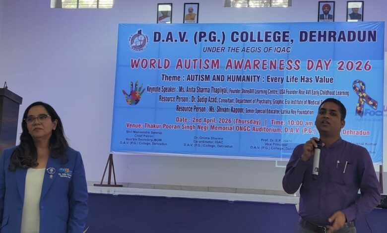 देहरादून! डी.ए.वी. महाविद्यालय, देहरादून द्वारा “विश्व ऑटिज़्म जागरूकता दिवस–2026” के अवसर पर “ऑटिज़्म और मानवता: हर जीवन का मूल्य है” विषय पर एक उच्चस्तरीय जागरूकता एवं अकादमिक कार्यक्रम का आयोजन किया गया। कार्यक्रम में ऑटिज़्म स्पेक्ट्रम डिसऑर्डर (ASD) के नैदानिक, मनोवैज्ञानिक, शैक्षिक एवं सामाजिक आयामों पर बहुआयामी विशेषज्ञ विमर्श प्रस्तुत किया गया।